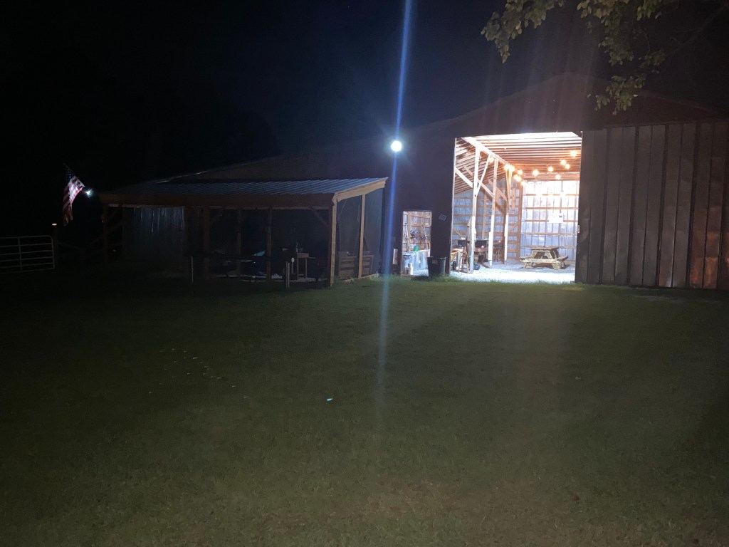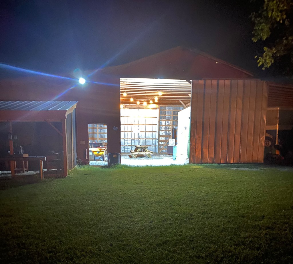 Our Barn features an open, large space with an extra-long picnic table in the center. We have a few extra tables and chairs available for a cake, other food & goodies, etc. There is more seating available in our “Beach” area. which is screened and covered, providing shade.